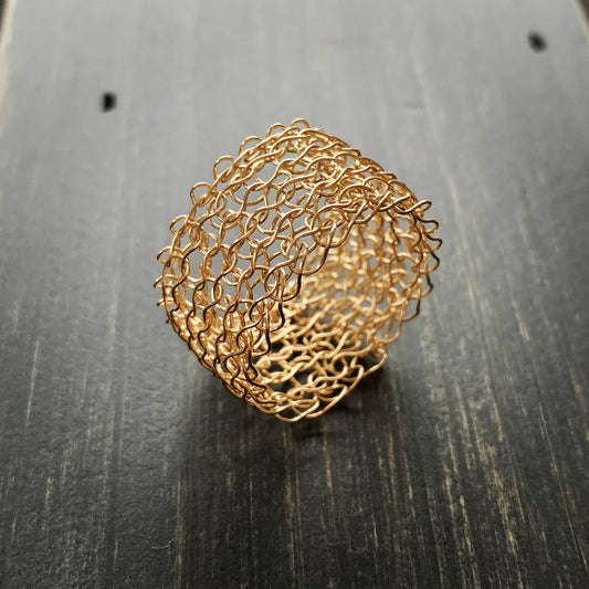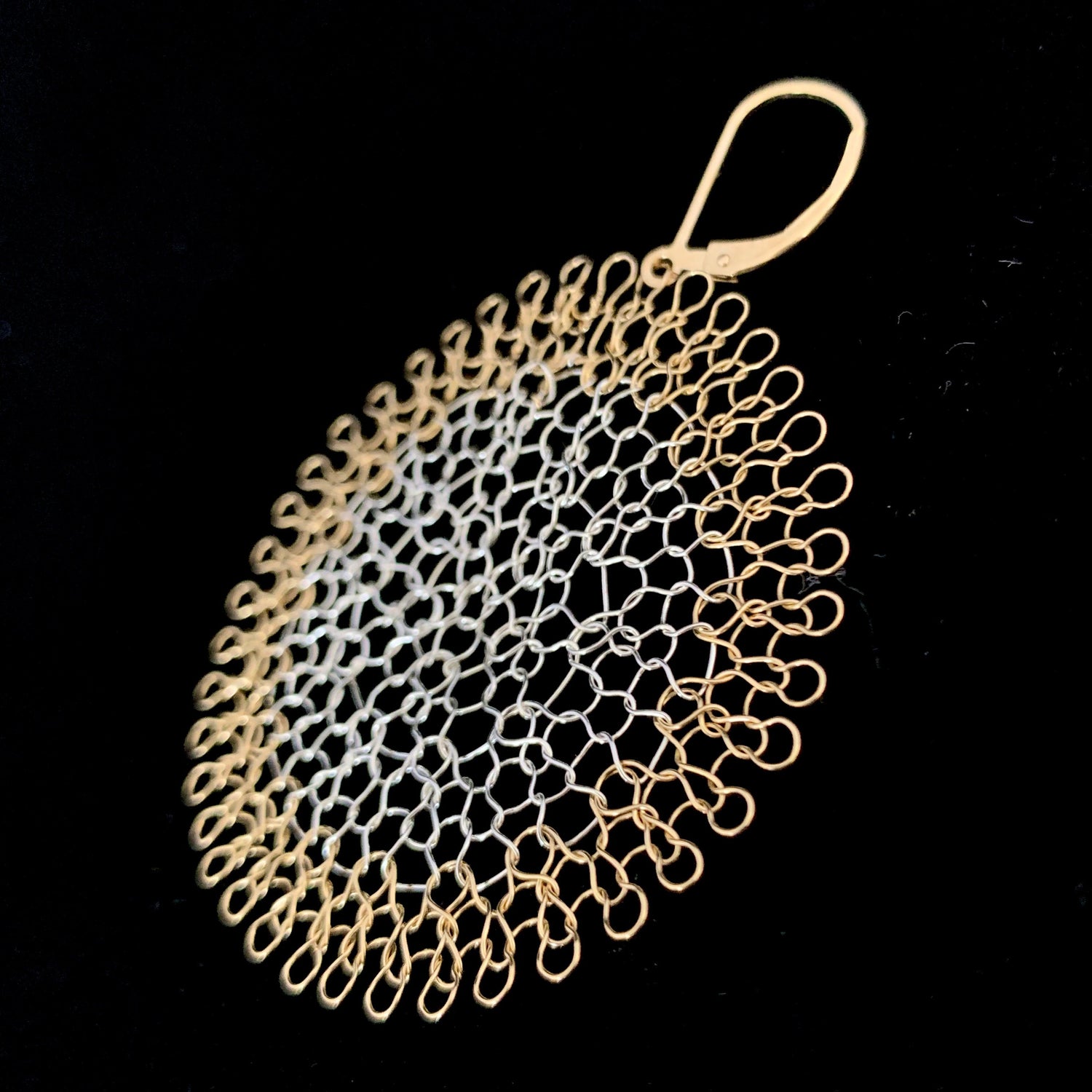 Ayant longtemps travaillé des matières textiles, j'ai souhaité retrouver la continuité et la régularité des mailles de tricot en remplaçant le fil de laine par un fil de métal précieux, d'Or ou d'Argent.